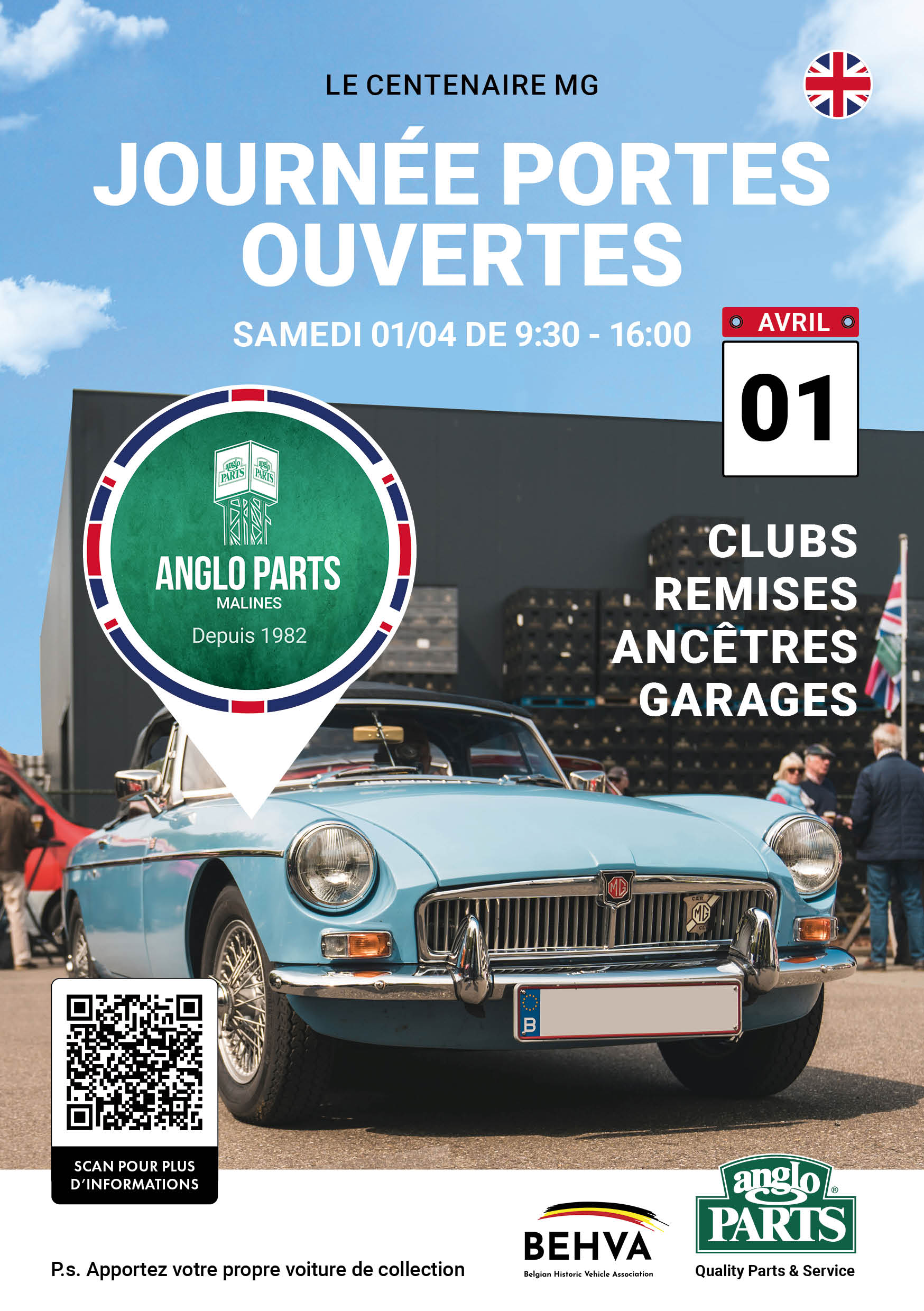 Anglo Parts organise sa journée portes ouvertes annuelle, cette foisle samedi 1er avril 2023 de 9h30 à 16h00 chez Anglo Parts Mechelen. Grâce à notre situation centrale, juste à côté de l'autoroute, nous sommes facilement accessibles. Nous aimerions vous inviter cordialement à ce qui, nous l'espérons, sera l'événement oldtimer britannique de l'année.